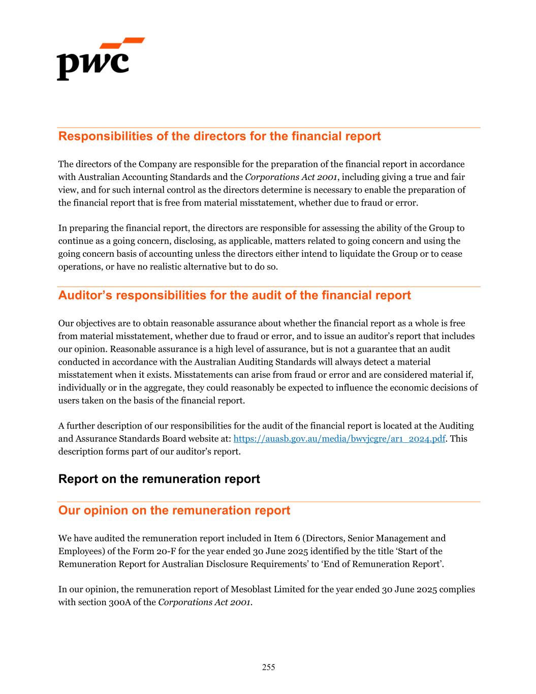 Responsibilities of the directors for the financial report The directors of the Company are responsible for the preparation of the financial report in accordance with Australian Accounting Standards and the Corporations Act 2001, including giving a true and fair view, and for such internal control as the directors determine is necessary to enable the preparation of the financial report that is free from material misstatement, whether due to fraud or error. In preparing the financial report, the directors are responsible for assessing the ability of the Group to continue as a going concern, disclosing, as applicable, matters related to going concern and using the going concern basis of accounting unless the directors either intend to liquidate the Group or to cease operations, or have no realistic alternative but to do so. Auditor’s responsibilities for the audit of the financial report Our objectives are to obtain reasonable assurance about whether the financial report as a whole is free from material misstatement, whether due to fraud or error, and to issue an auditor’s report that includes our opinion. Reasonable assurance is a high level of assurance, but is not a guarantee that an audit conducted in accordance with the Australian Auditing Standards will always detect a material misstatement when it exists. Misstatements can arise from fraud or error and are considered material if, individually or in the aggregate, they could reasonably be expected to influence the economic decisions of users taken on the basis of the financial report. A further description of our responsibilities for the audit of the financial report is located at the Auditing and Assurance Standards Board website at: https://auasb.gov.au/media/bwvjcgre/ar1_2024.pdf. This description forms part of our auditor's report. Report on the remuneration report Our opinion on the remuneration report We have audited the remuneration report included in Item 6 (Directors, Senior Management and Employees) of the Form 20-F for the year ended 30 June 2025 identified by the title ‘Start of the Remuneration Report for Australian Disclosure Requirements’ to ‘End of Remuneration Report’. In our opinion, the remuneration report of Mesoblast Limited for the year ended 30 June 2025 complies with section 300A of the Corporations Act 2001. 255