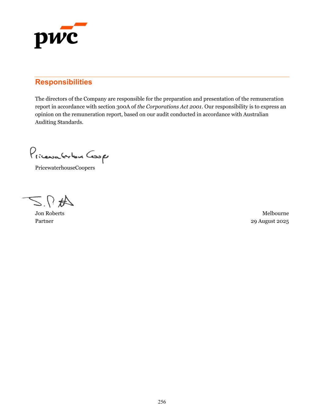 Responsibilities The directors of the Company are responsible for the preparation and presentation of the remuneration report in accordance with section 300A of the Corporations Act 2001. Our responsibility is to express an opinion on the remuneration report, based on our audit conducted in accordance with Australian Auditing Standards. PricewaterhouseCoopers Jon Roberts Melbourne Partner 29 August 2025 256