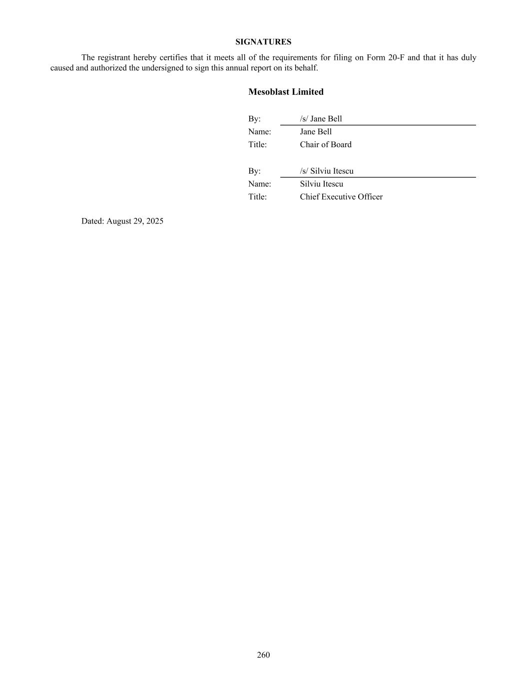 SIGNATURES The registrant hereby certifies that it meets all of the requirements for filing on Form 20-F and that it has duly caused and authorized the undersigned to sign this annual report on its behalf. Mesoblast Limited By: /s/ Jane Bell Name: Jane Bell Title: Chair of Board By: /s/ Silviu Itescu Name: Silviu Itescu Title: Chief Executive Officer Dated: August 29, 2025 260
