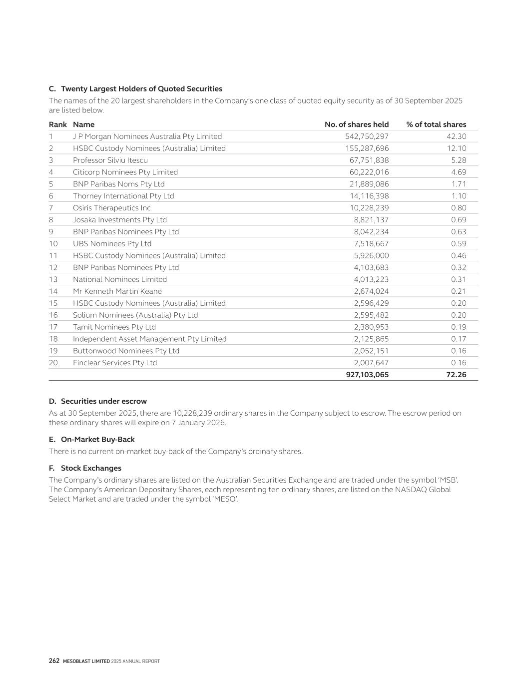 C. Twenty Largest Holders of Quoted Securities The names of the 20 largest shareholders in the Company’s one class of quoted equity security as of 30 September 2025 are listed below. Rank Name No. of shares held % of total shares 1 J P Morgan Nominees Australia Pty Limited 542,750,297 42.30 2 HSBC Custody Nominees (Australia) Limited 155,287,696 12.10 3 Professor Silviu Itescu 67,751,838 5.28 4 Citicorp Nominees Pty Limited 60,222,016 4.69 5 BNP Paribas Noms Pty Ltd 21,889,086 1.71 6 Thorney International Pty Ltd 14,116,398 1.10 7 Osiris Therapeutics Inc 10,228,239 0.80 8 Josaka Investments Pty Ltd 8,821,137 0.69 9 BNP Paribas Nominees Pty Ltd 8,042,234 0.63 10 UBS Nominees Pty Ltd 7,518,667 0.59 11 HSBC Custody Nominees (Australia) Limited 5,926,000 0.46 12 BNP Paribas Nominees Pty Ltd 4,103,683 0.32 13 National Nominees Limited 4,013,223 0.31 14 Mr Kenneth Martin Keane 2,674,024 0.21 15 HSBC Custody Nominees (Australia) Limited 2,596,429 0.20 16 Solium Nominees (Australia) Pty Ltd 2,595,482 0.20 17 Tamit Nominees Pty Ltd 2,380,953 0.19 18 Independent Asset Management Pty Limited 2,125,865 0.17 19 Buttonwood Nominees Pty Ltd 2,052,151 0.16 20 Finclear Services Pty Ltd 2,007,647 0.16 927,103,065 72.26 D. Securities under escrow As at 30 September 2025, there are 10,228,239 ordinary shares in the Company subject to escrow. The escrow period on these ordinary shares will expire on 7 January 2026. E. On-Market Buy-Back There is no current on-market buy-back of the Company’s ordinary shares. F. Stock Exchanges The Company’s ordinary shares are listed on the Australian Securities Exchange and are traded under the symbol ‘MSB’. The Company’s American Depositary Shares, each representing ten ordinary shares, are listed on the NASDAQ Global Select Market and are traded under the symbol ‘MESO’. 262 MESOBLAST LIMITED 2025 ANNUAL REPORT