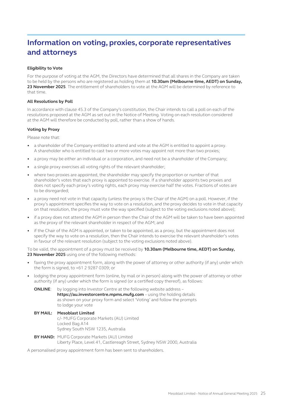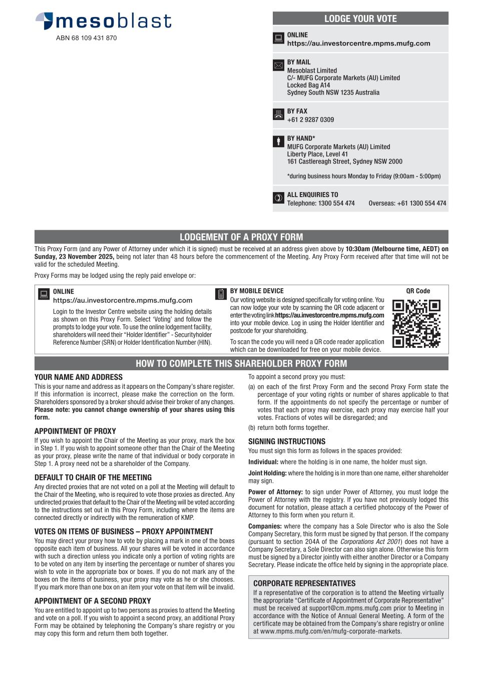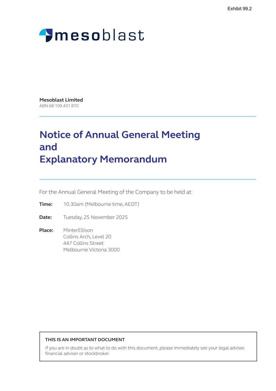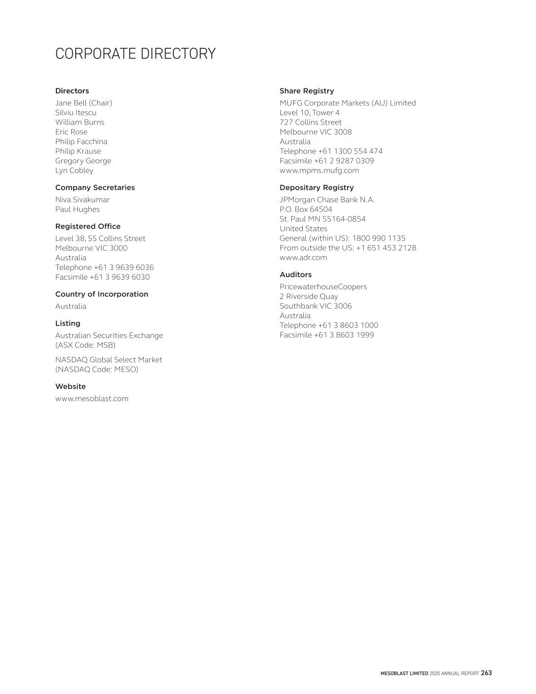 CORPORATE DIRECTORY Directors Jane Bell (Chair) Silviu Itescu William Burns Eric Rose Philip Facchina Philip Krause Gregory George Lyn Cobley Company Secretaries Niva Sivakumar Paul Hughes Registered Office Level 38, 55 Collins Street Melbourne VIC 3000 Australia Telephone +61 3 9639 6036 Facsimile +61 3 9639 6030 Country of Incorporation Australia Listing Australian Securities Exchange (ASX Code: MSB) NASDAQ Global Select Market (NASDAQ Code: MESO) Website www.mesoblast.com Share Registry MUFG Corporate Markets (AU) Limited Level 10, Tower 4 727 Collins Street Melbourne VIC 3008 Australia Telephone +61 1300 554 474 Facsimile +61 2 9287 0309 www.mpms.mufg.com Depositary Registry JPMorgan Chase Bank N.A. P.O. Box 64504 St. Paul MN 55164-0854 United States General (within US): 1800 990 1135 From outside the US: +1 651 453 2128 www.adr.com Auditors PricewaterhouseCoopers 2 Riverside Quay Southbank VIC 3006 Australia Telephone +61 3 8603 1000 Facsimile +61 3 8603 1999 MESOBLAST LIMITED 2025 ANNUAL REPORT 263